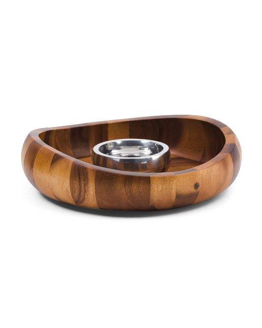 Mango Wood Chip and Dip Tray with Stainless Steel Bowl Stylish Round Wooden Serving Tray for Snacks and Dips