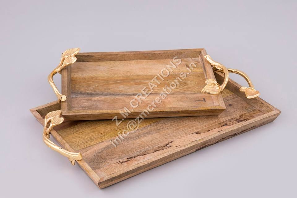 Mango Wood Serving Tray Set With Gold Aluminum Metal Handle Square Shape for Home Wedding Christmas Events INS Design Style