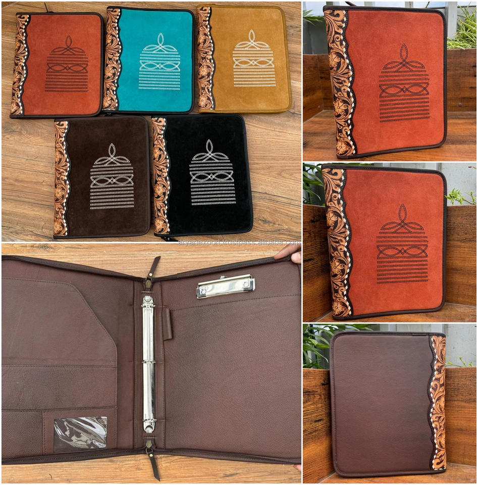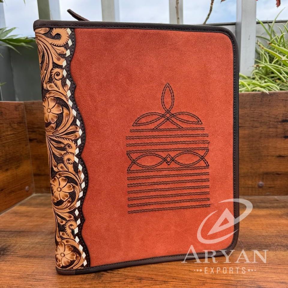 Manufacture A4 Boot Stitch Hand Tooled Suede Leather Zippered Business Portfolio Conference File Folders Covers Agenda Organizer
