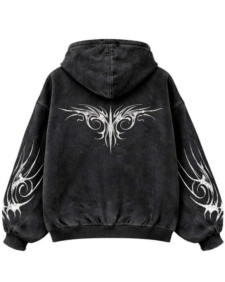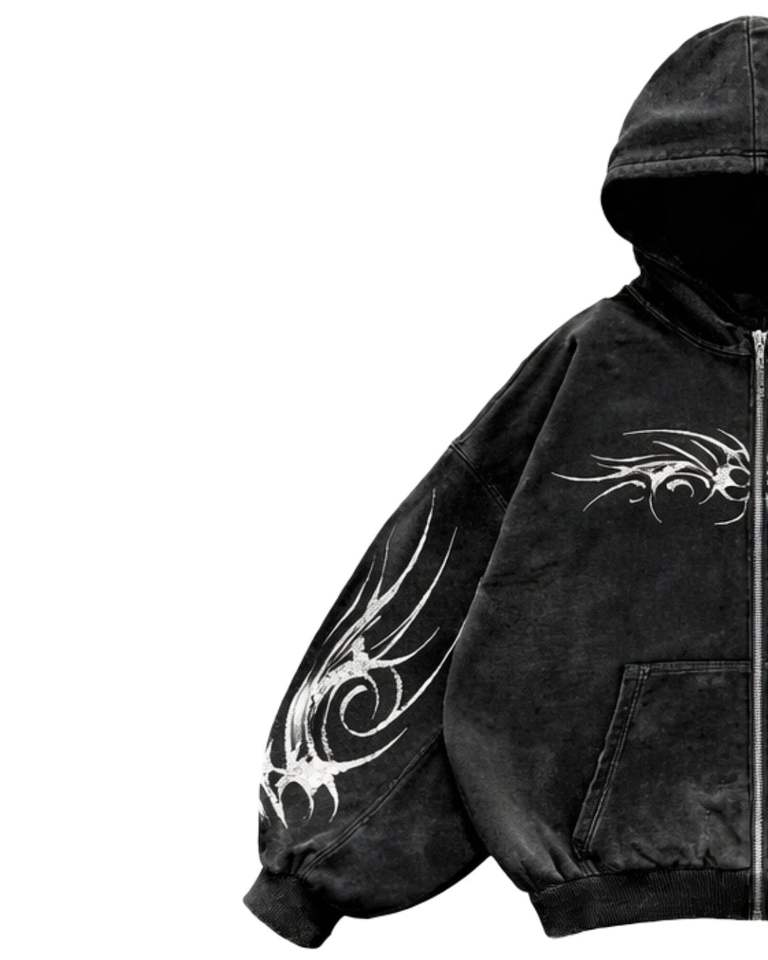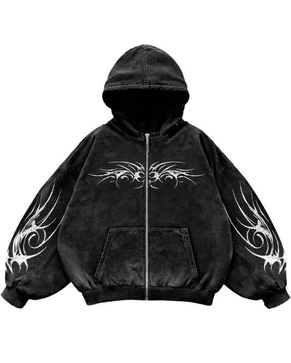 Manufacturer Black Acid Washed Zip Up Hoodie With Gothic Tribal White Print Oversized Streetwear Women Cotton Fleece Jacket