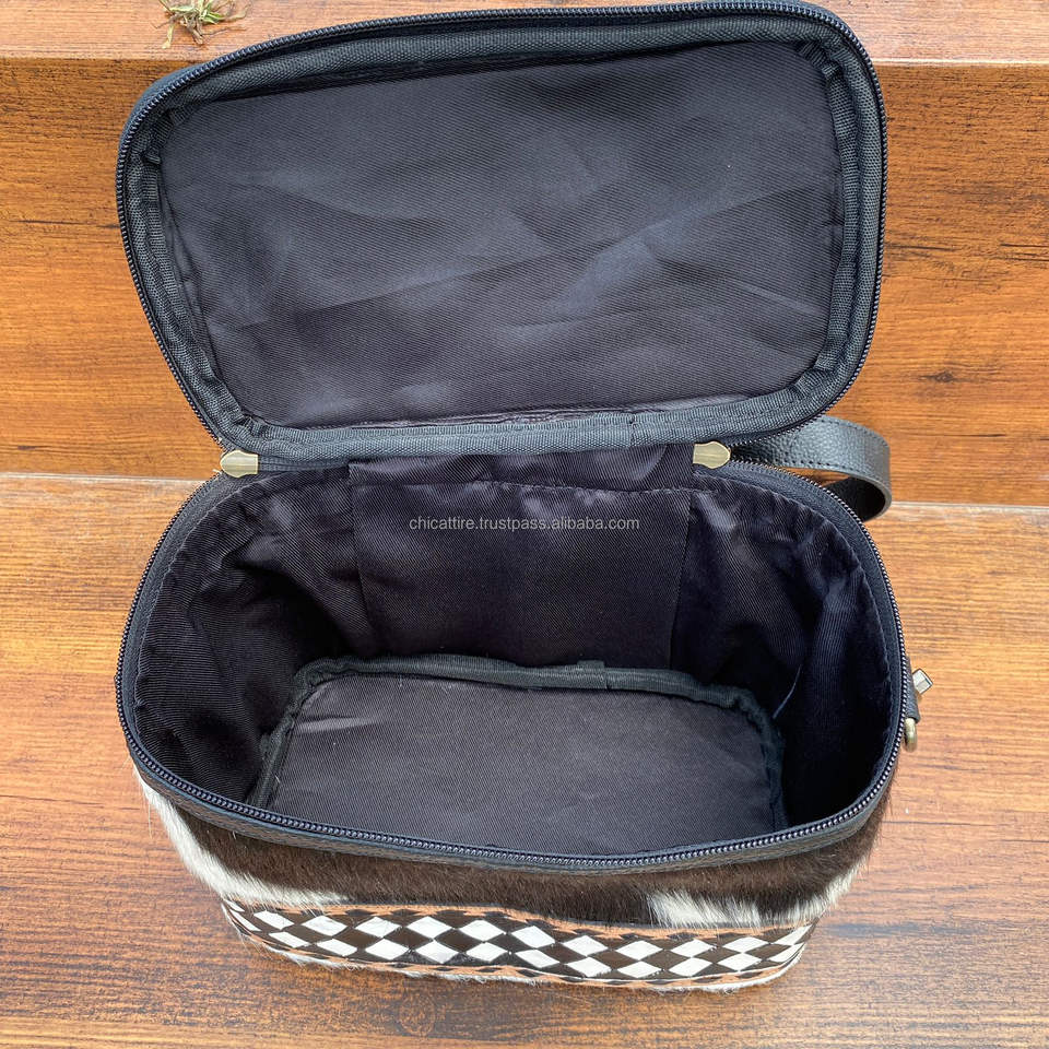 Manufacturer Checkered Tooled Cowhide Leather Large Capacity Card Design Portable Travel Zipper Cosmetic Makeup Organizer Bag