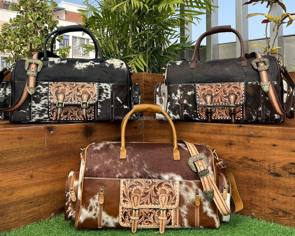 Manufacturer Custom Design Large Hand Tooled Leather Duffel Bag Cowhide Travel Bag for Men & Women Luxury Weekend Overnight Bags
