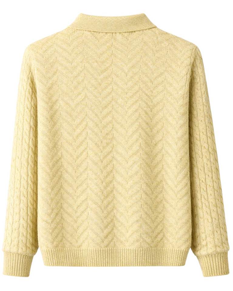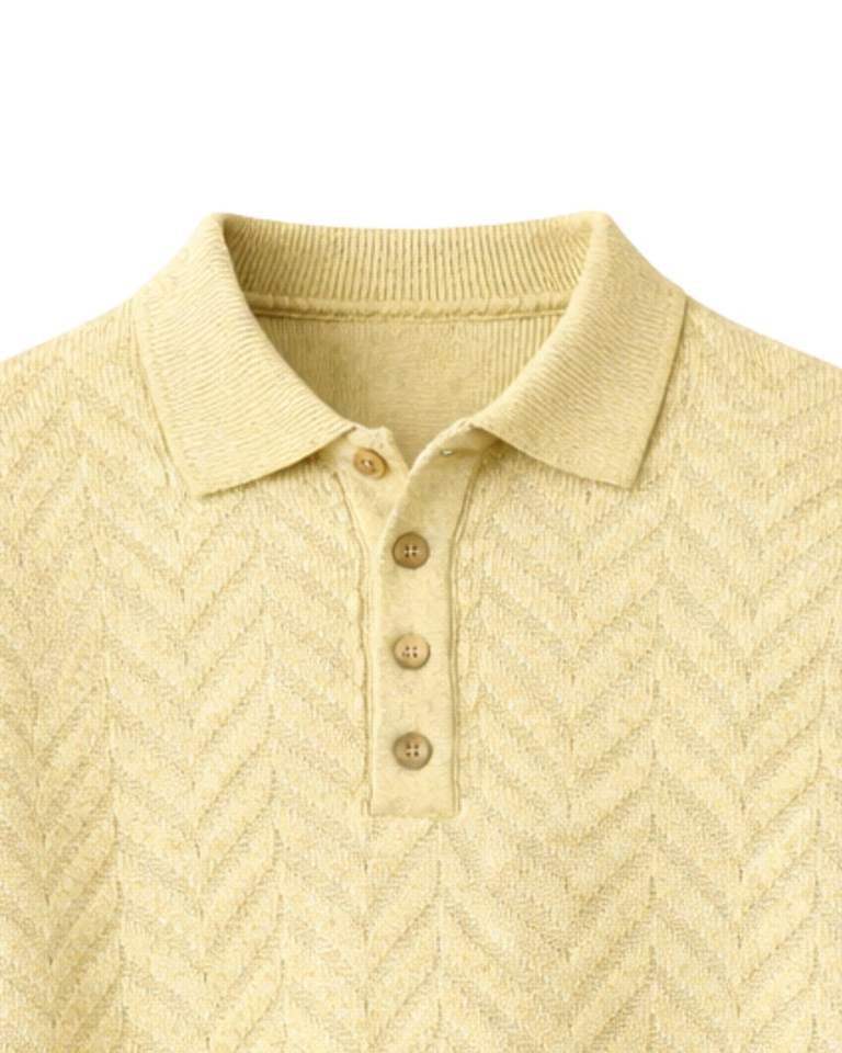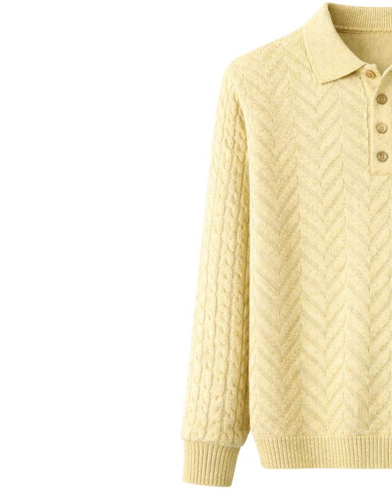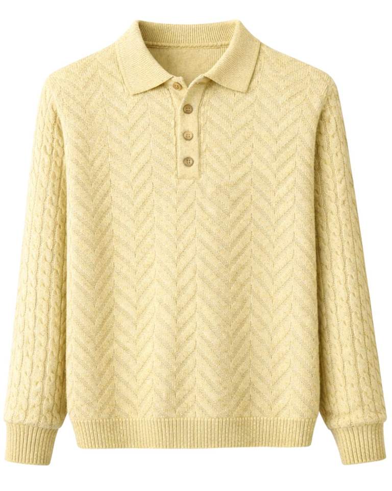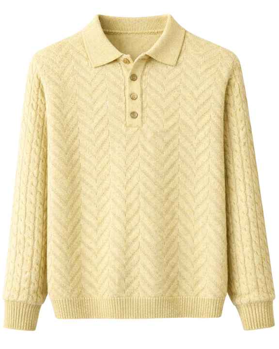 Manufacturer Custom Men Light Yellow Polo Collar Textured Knit Wool Sweater Long Sleeve Winter Pullover Soft Warm Casual Wear
