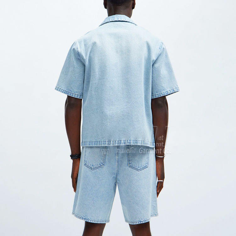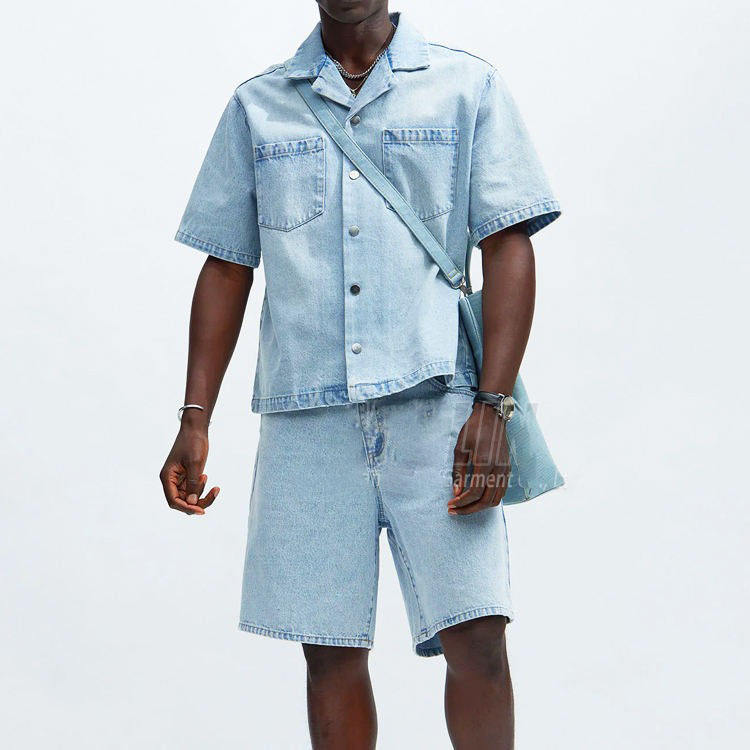 Manufacturer Custom Two Piece Men Jeans Sets Blank High Quality Short Sleeve Button Shirts and Jean Shorts Streetwear Denim Set
