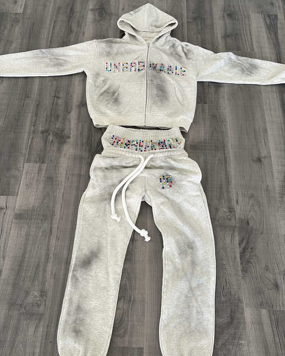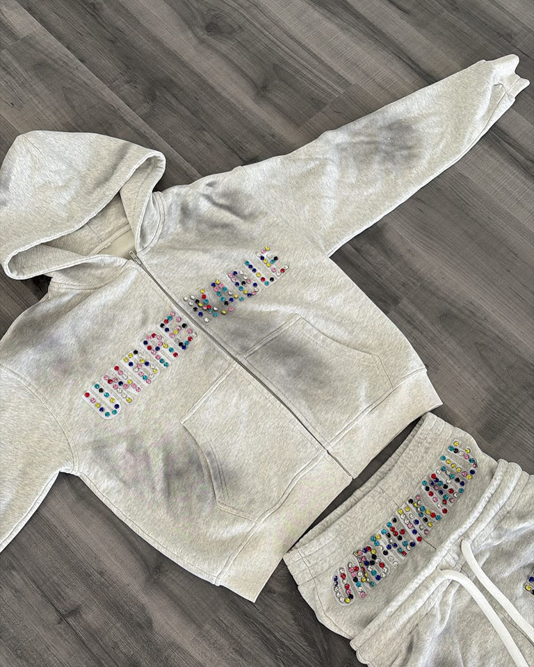 Manufacturer Custom Zipper Hoodie Double Waisted Sweatpants Different Colour Rhinestone Vintage Acid Wash Tracksuits for Men