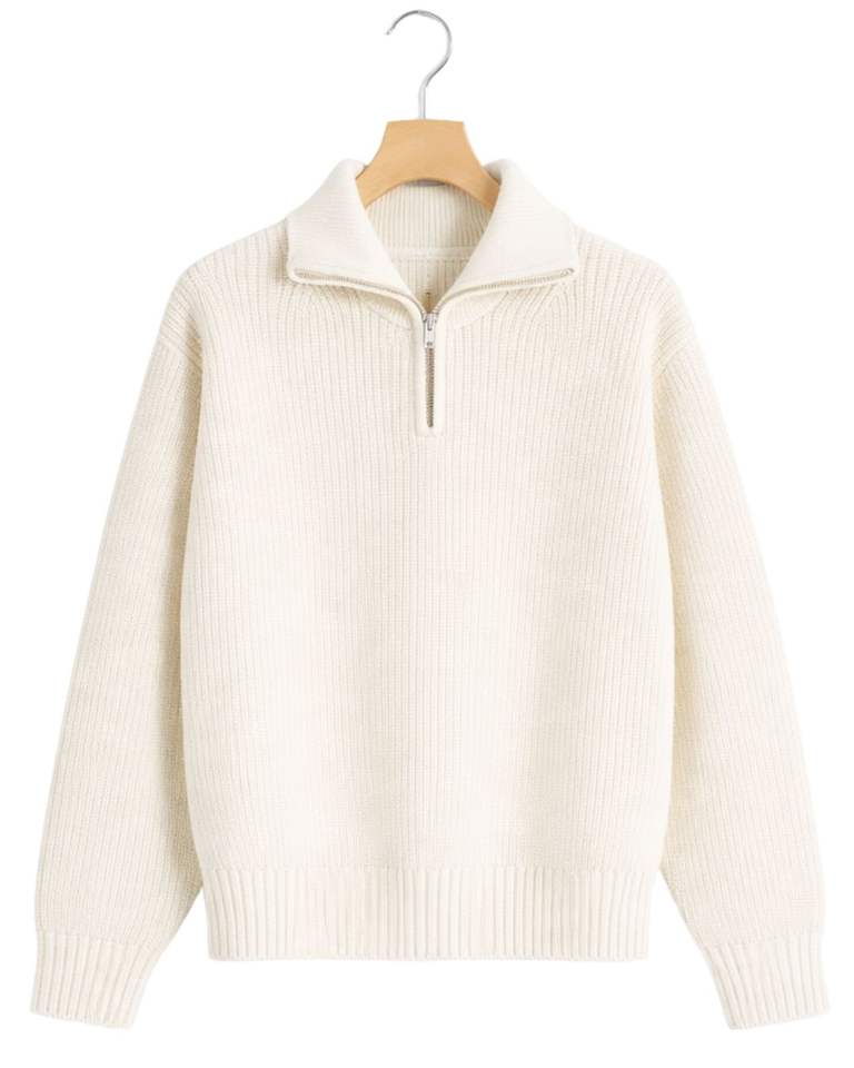 Manufacturer Customized Mens Quarter Zip Knit Sweater White Ribbed Texture High Neck Warm Winter Casual Pullover OEM Custom