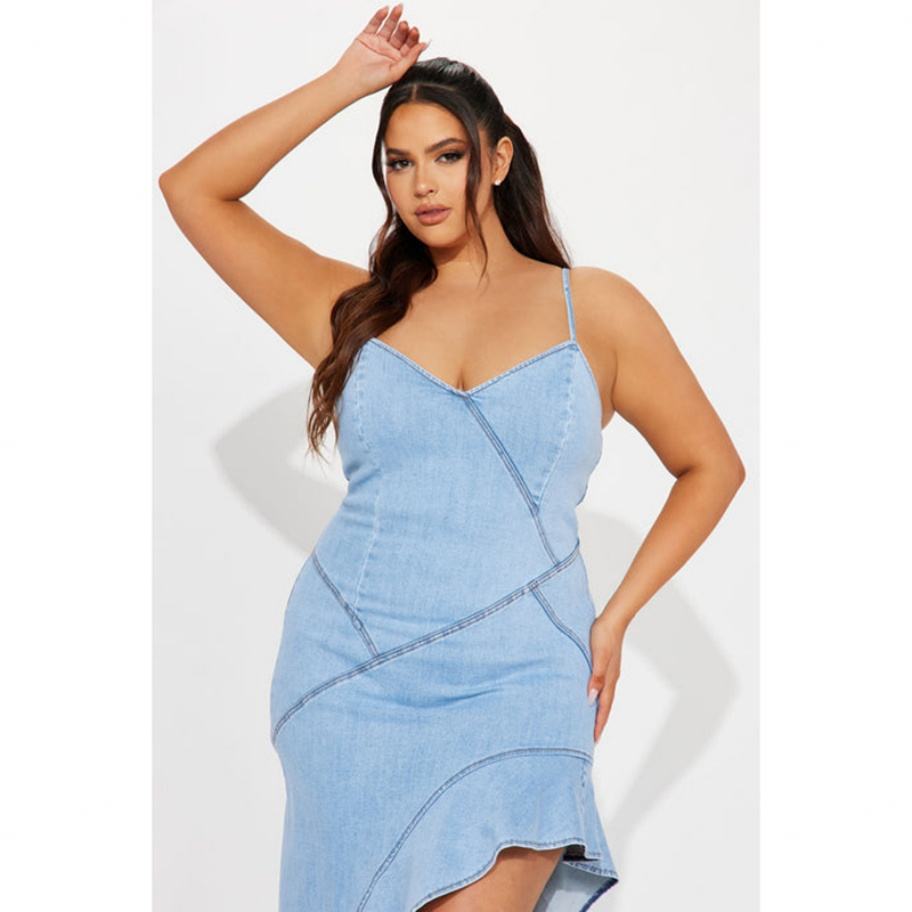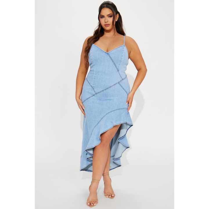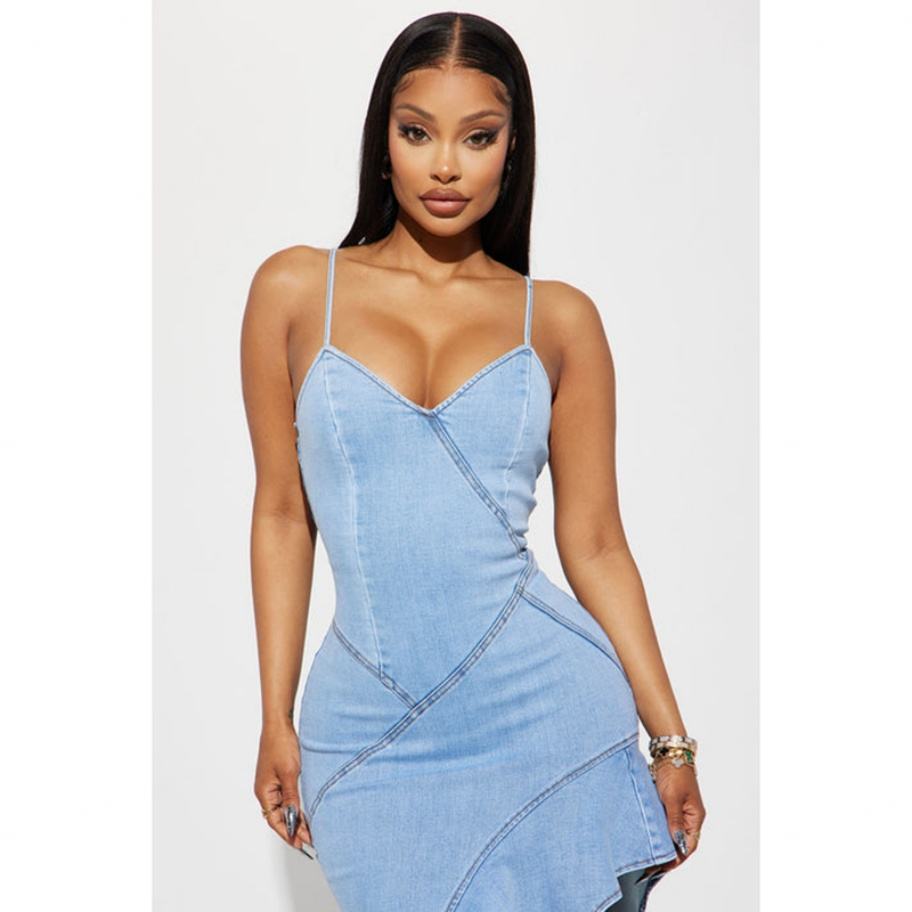 Manufacturer Customized Style Color Denim Spaghetti Straps High Slit Ruffle Hem Women Causal Dress