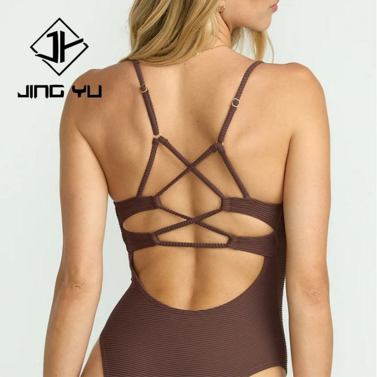Manufacturer High Quality Brown Vintage Hollow Strap Swimsuit Custom Recycled Nylon Swimwear Women One Piece