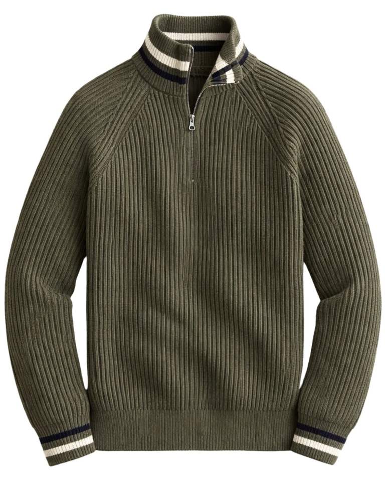 Manufacturer Mens Quarter Zip Knit Sweater Olive Green Ribbed Texture Stripe Collar High Neck Warm Winter Pullover OEM Custom