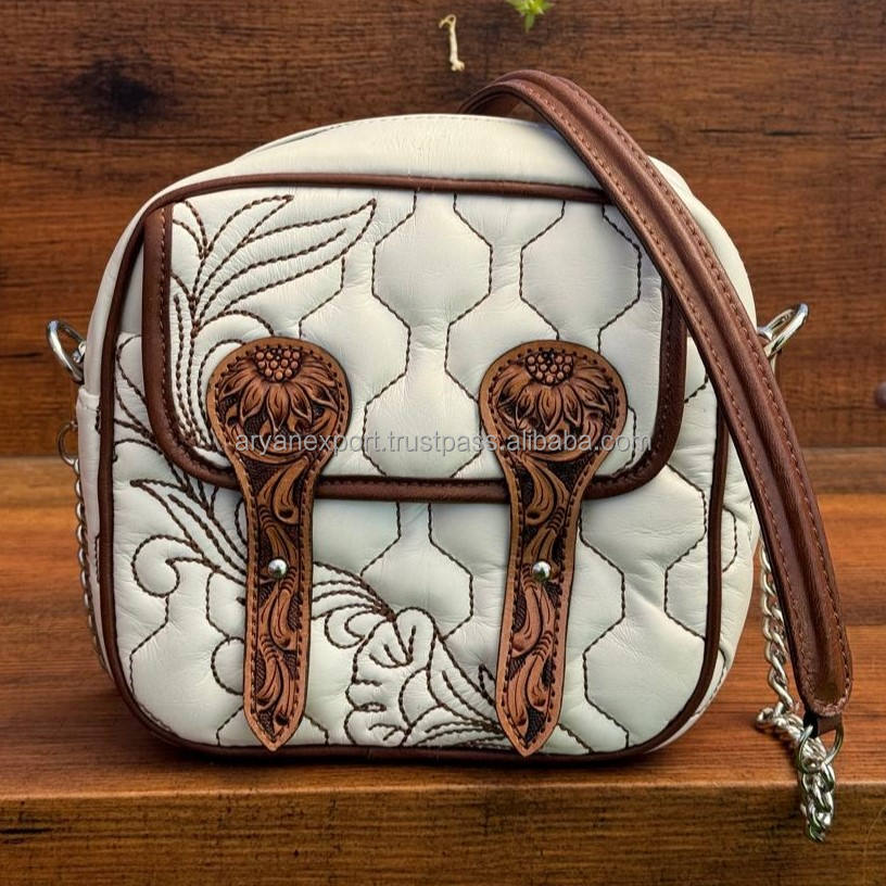 Hand Tooled Quilted Chain Crossbody Strap Handbags