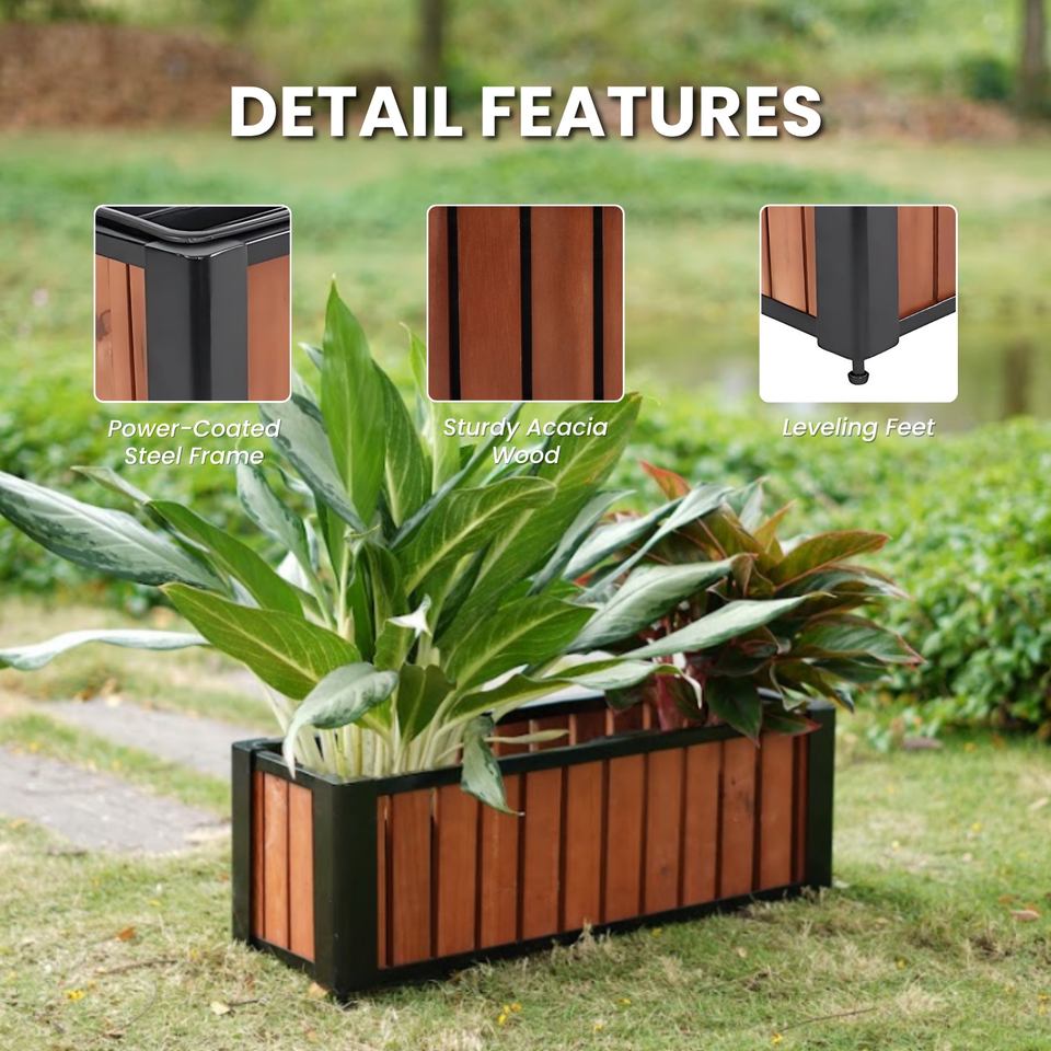 Modern Pine Wood Planter Box with Powder Coated Steel Frame Rectangular Outdoor Flower Pot for Home Garden Drainage Hole