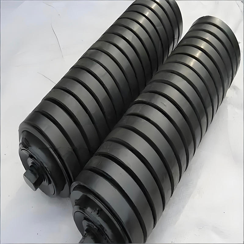 Manufacturer wholesale cast rubber buffer idlers for belt conveyors, parallel groove type functional rubber buffer idlers