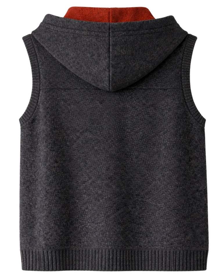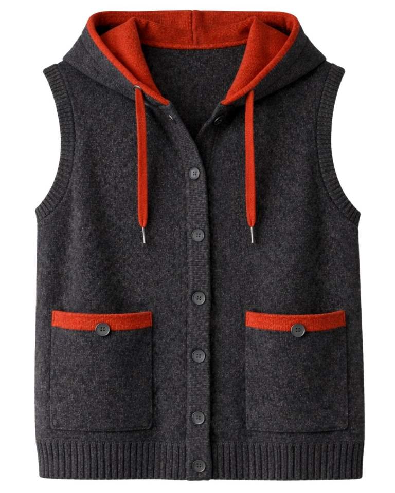 ManufacturerCharcoal Grey Hooded Knitted Sweater Vest With Red Contrast Sleeveless Button Front Wool Acrylic Winter Cardigan OEM