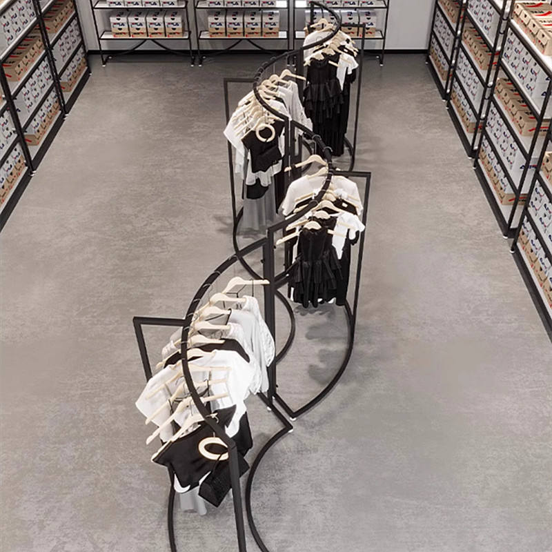 Manufacturers Provide Custom Curve Shape Black Clothing Shop Island Display Rack Show Clothing Display Hanging Racks
