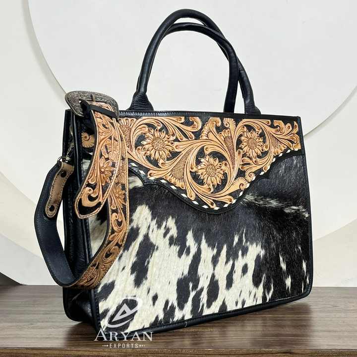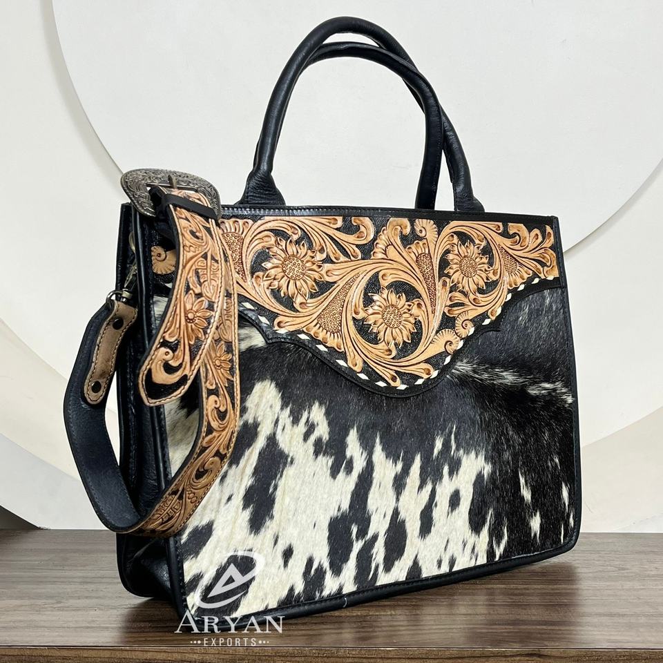 Hand Tooled Cowhide Leather Shoulder Tote Bag