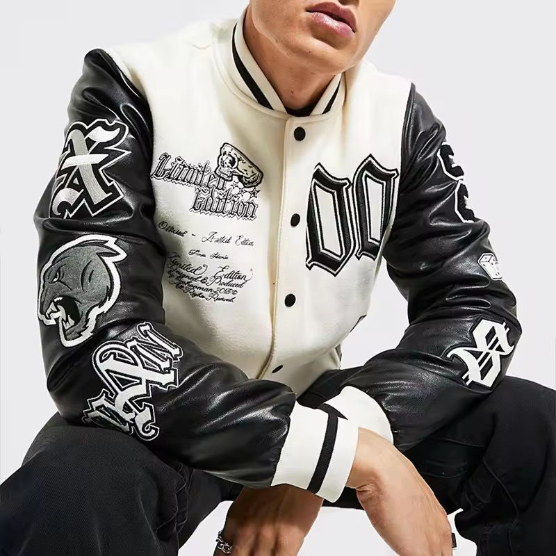 Manufacturers for Custom Clothes Logo Hip Hop Patch Applique Embroidery Leather Jackets Velvet Chenille Bomber Jacket for Men