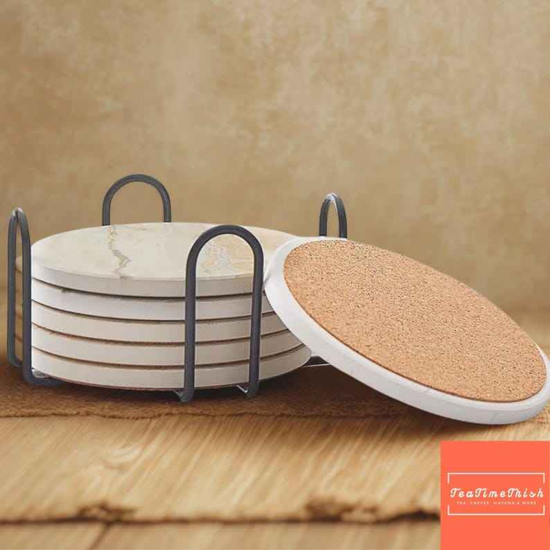 Marble Stone Coasters Set Of 6 With Non Slip Cork Bottom And Metal Holder Table Protection