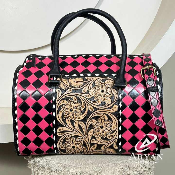 Hand Tooled Checkered Leather Speedy Duffel Bag