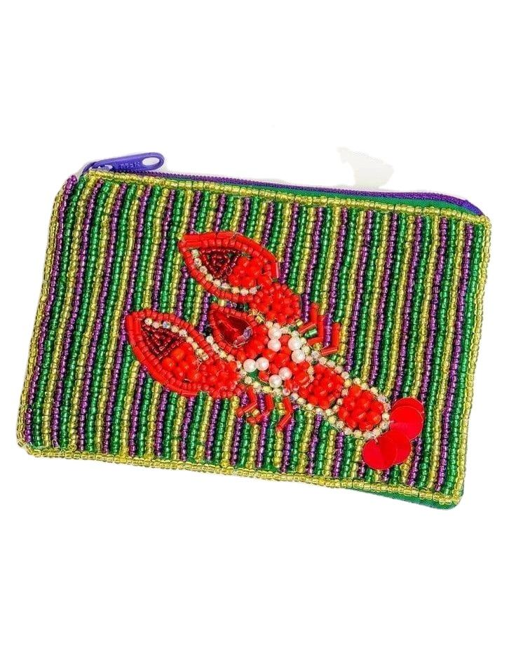 Mardi Gras Crawfish beaded embroidery coin pouch Lobster glass beads mini zipper purse Mardi Gras colour purple/yellow/green bag