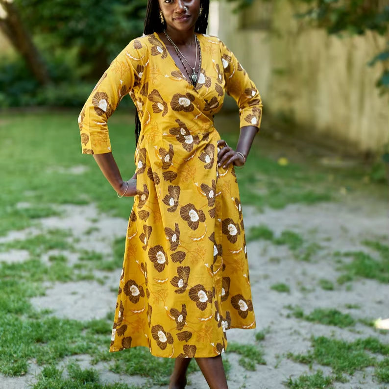 Marigold Bohemian Hand Block Printed Floral Wrap Dress Pure Cotton Adjustable Waist