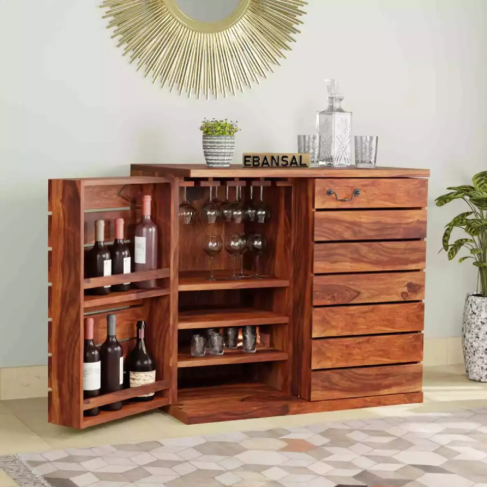 Marine Plywood & Veneer Finished Home Bar Cabinet on Wheels With Storage Bar Table Display Shelf for Living Room Home Furniture