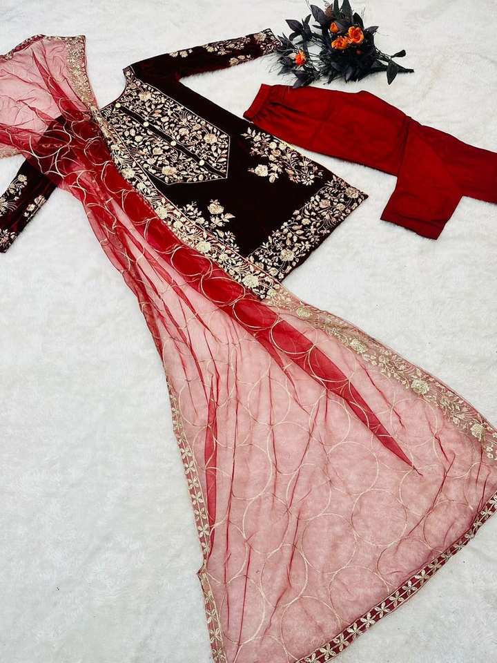 Maroon Designer Embroidery Velvet Salwar Kameez Readymade Indian Partywear 3 Piece Velvet Kurta Palazzo Set Soft Net Dupatta