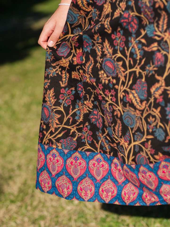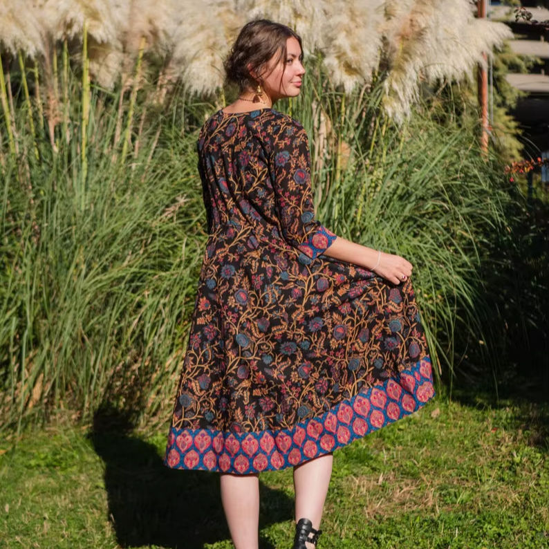 Marrakesh Bohemian Dress Calf Length Pure Cotton Hand Block Printed Black Blue Pink | Handmade Ethical Panelled Summer Outfit