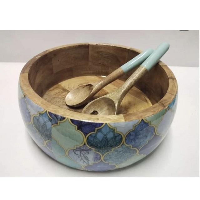 Marvelous Design Enamel Printed Wood Food Serving Bowl Premium Quality Round Shape Dessert Serving Bowl with Salad Mixing Tools