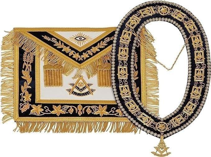Masonic Regalia Past Master Masons Officer Apron Hand Embroidered Navy Blue & Chain Collar with Past Master Jewel