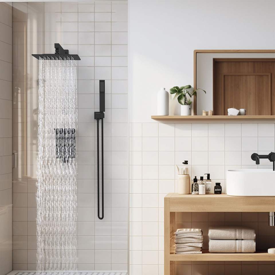 Matte Black Luxury Bathroom Set 10 Inch Rainfall Shower System Storage Rack High Pressure Square Shower Head Wall-Mount Faucet