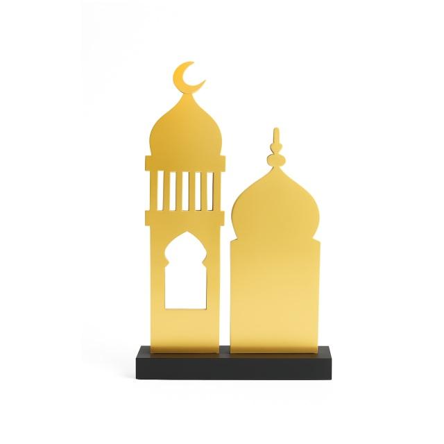 Matte Black Mosque Silhouette on Wooden Base Islamic Table Decor for Eid Ramadan Crescent Dome Gift Prayer Room Accent Ornament