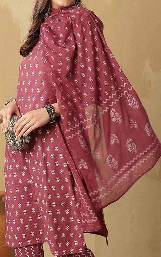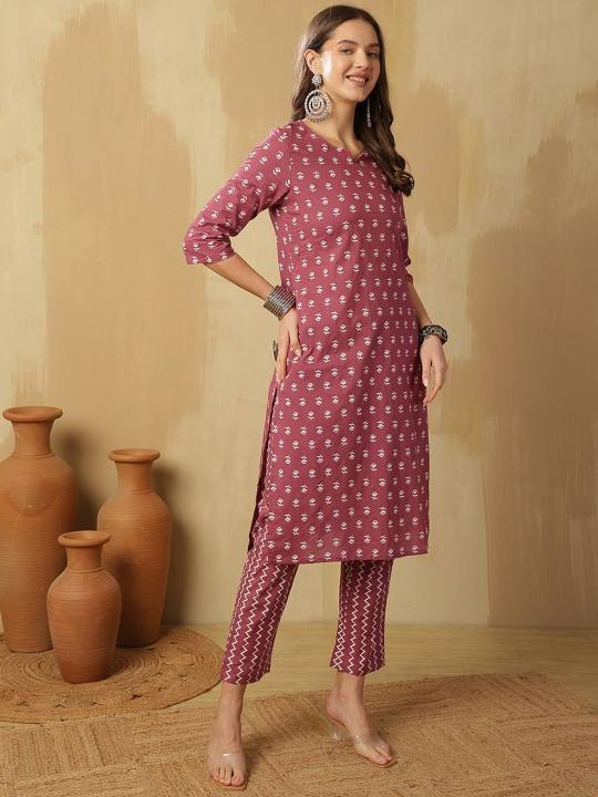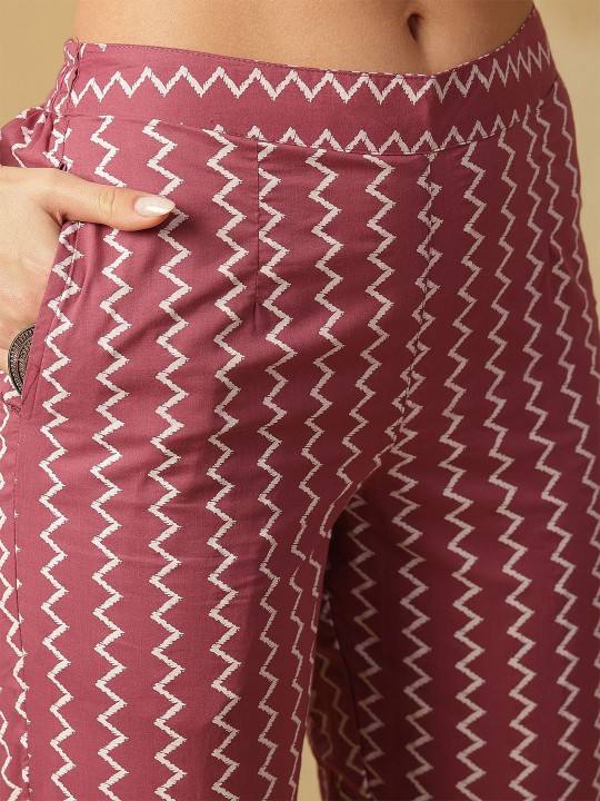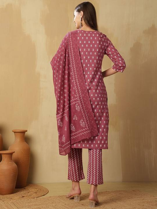 Mauve Ethnic Motifs Printed Pure Cotton Notch-Neck Kurta With Trousers & Dupatta With Trouser Bulk product Customized Women