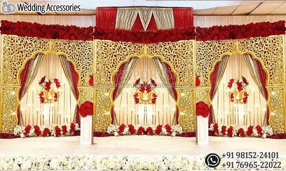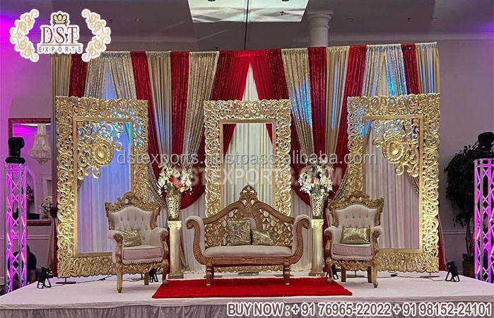 Medallion Wedding Anniversary Stage Decoration Premium Gold Theme Wedding Reception Stage Elegant Wedding Reception Stage Decor