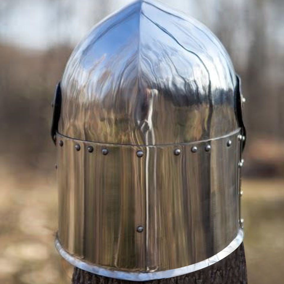 Medieval Knight Bascinet Silver Helmet Wearable Armor with Brass Trim and Adjustable Leather Straps for Historical Reenactment