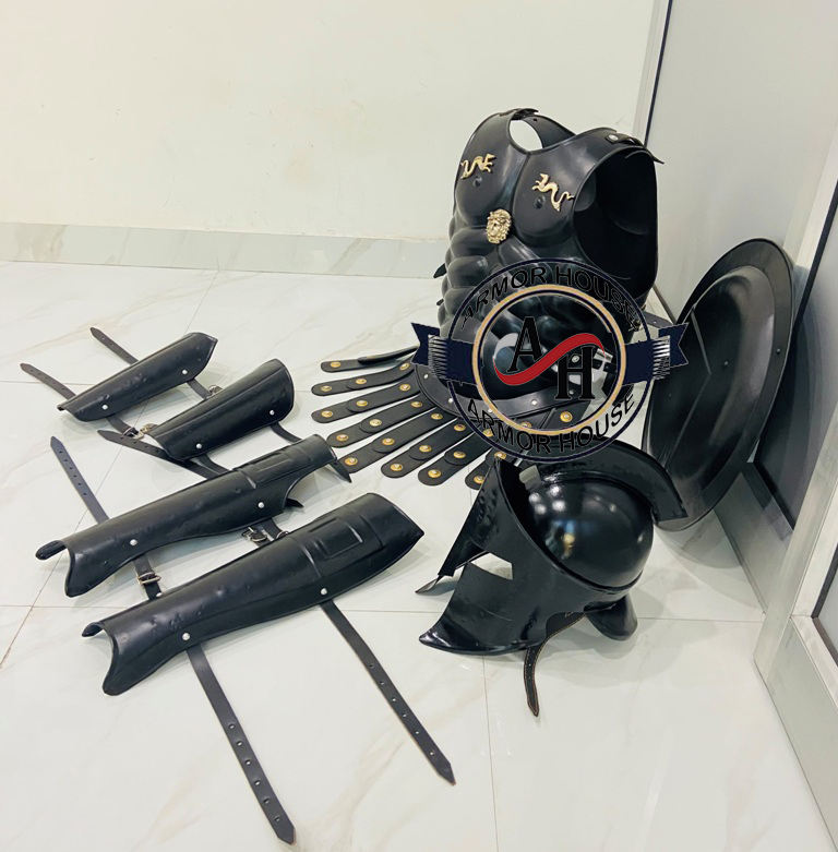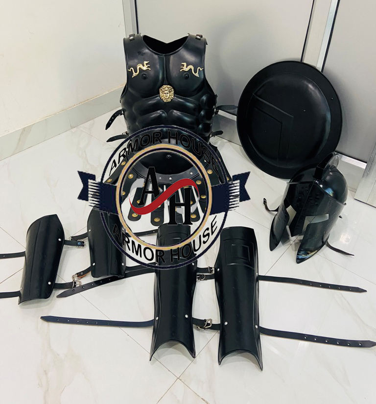 Medieval Muscle Jacket & Spartan Helmet Armor Black Finishes Costume Medieval Vintage 300 King Leonidas Spartan 18 Ga Steel Arm
