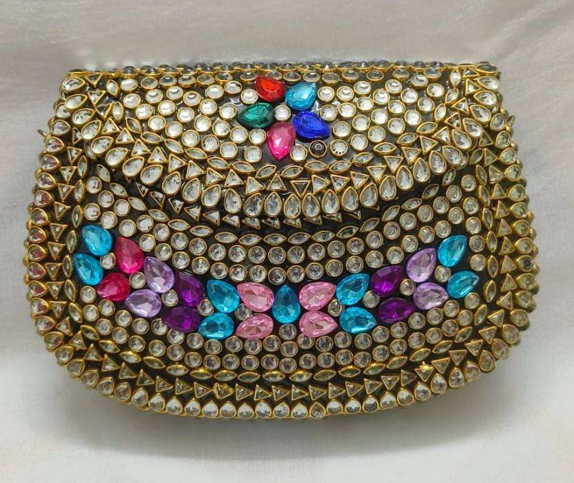 Medium Size Brass Handmade Oval Kundan Clutch Golden Indian Wedding Traditional Handmade Glass Mosaic Feng Shui Purse Glamour