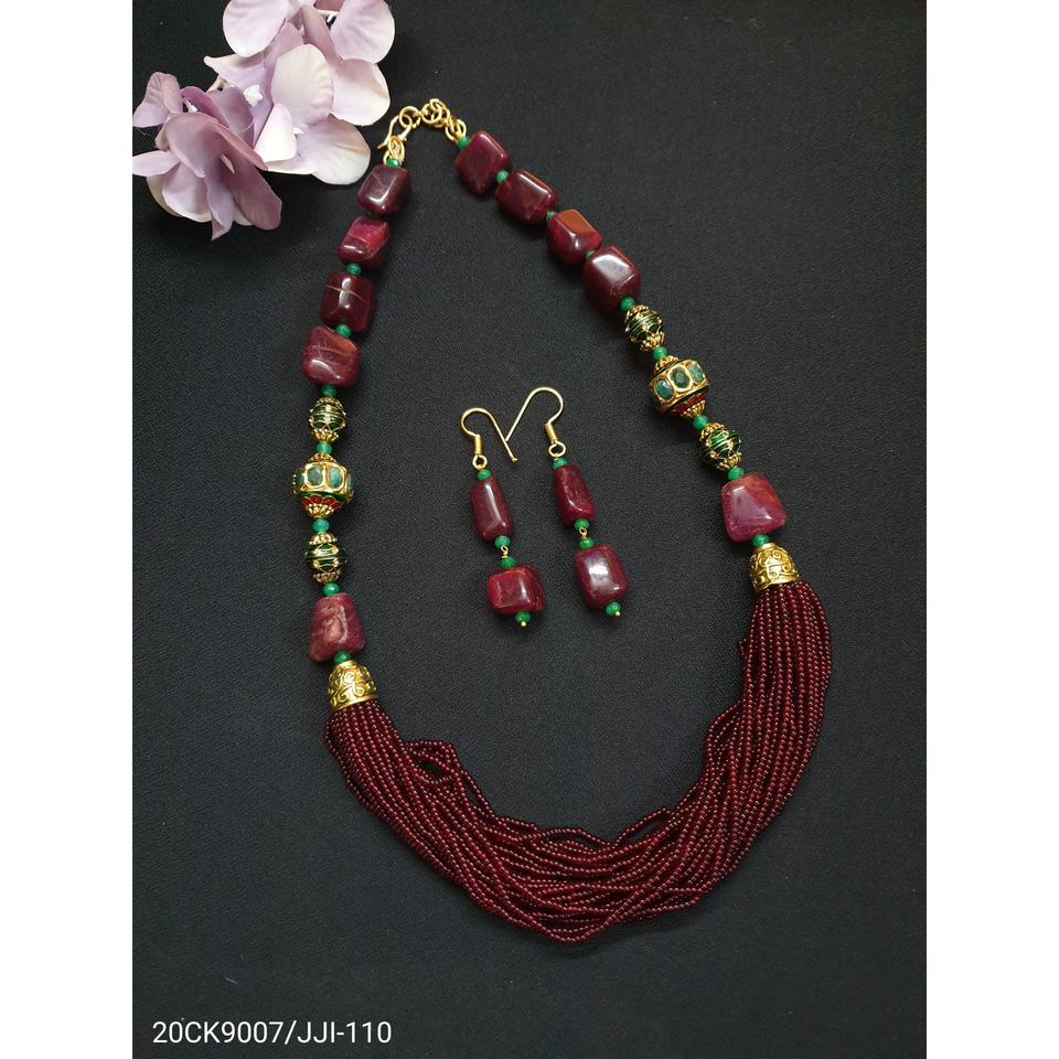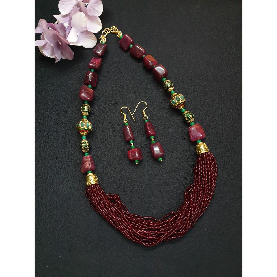 Meenakari Beads Handcrafted Chunky Seed Beaded Necklace Set with Maroon Multi Strand Design and Matching Dangle Earrings