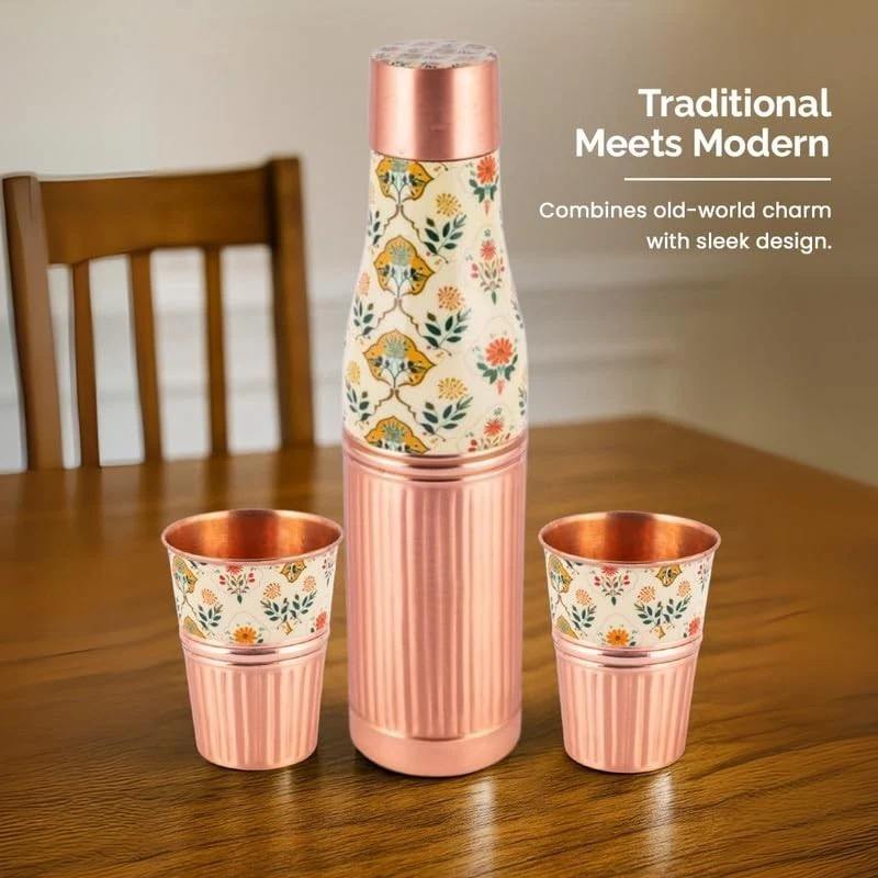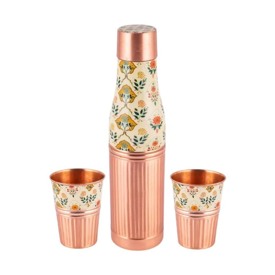 Meenakari Copper Bottle Set Hammered Copper Bottle Combo 900ML Copper Bottle Set Half Hammered Half Meenakari Bottle