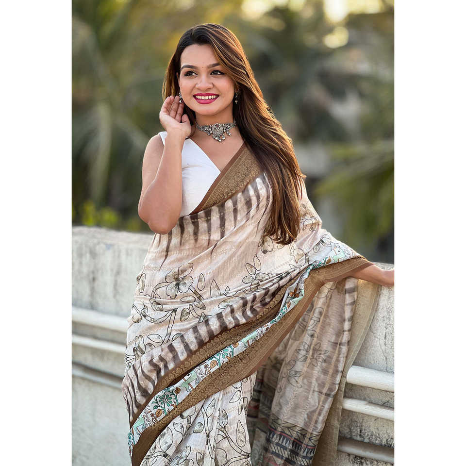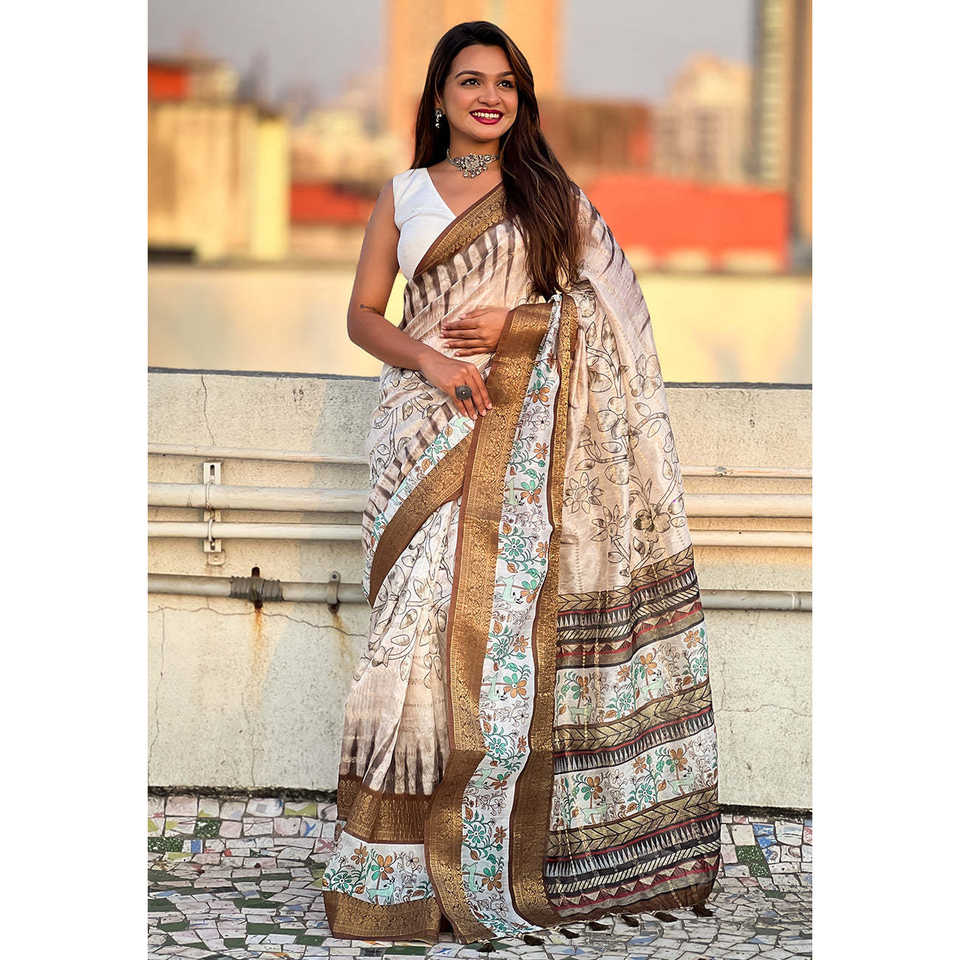 Elite Weaves Mehandi Green Chanderi Crush Silk Saree Floral Printed Zari Woven Jacquard Panel Border Indian Pakistani Clothing