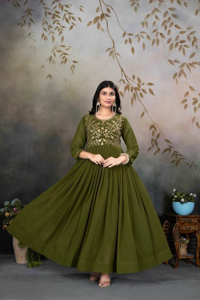 Mehndi Colour Design Faux Georgette Embroidery Evening Night Party Special V Neck Long Length Fancy Kurti Set At Wholesale