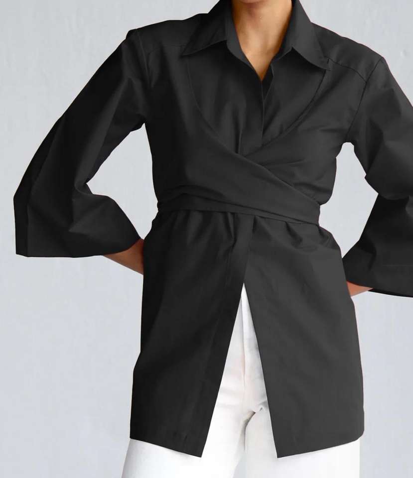 Melanie Slim Fit Wrap Shirt 100% Linen Black Mini Dress with Bell Sleeves and Waist-Tie Straps-Claire Mini Shirt Dress