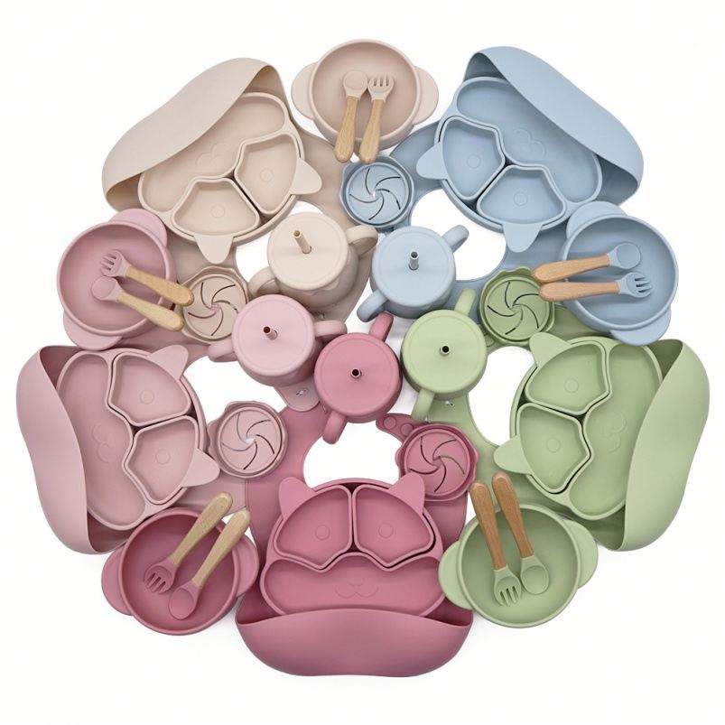 Melikey Factory Soft BPA Free Kids Dinnerware Set Baby Utensils Animal Plate Suction Baby Bowl Silicone Baby Feeding Set