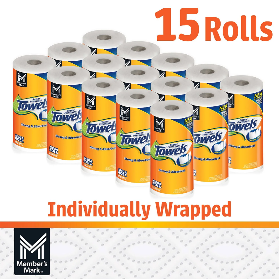 Member's Mark Super Premium 2-Ply White Paper Towels Select Tear 15 Mega Rolls for Home Soft Absorbent Disposable Kitchen Roll