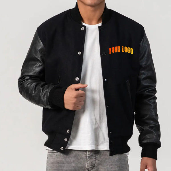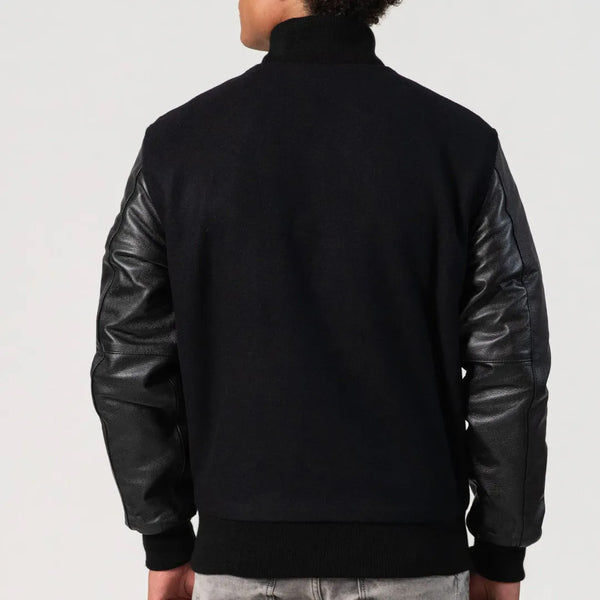Men American Letterman Baseball School Team Varsity Jacket Black Wool and Black Real Leather Sleeves Varsiti Jacket