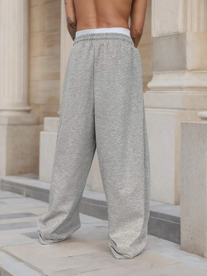 Men Baggy Wide Leg Sweatpants Regular Fit Flare Bottom Trousers Drawstring Waist Pockets 100% Cotton Solid High Street Urban