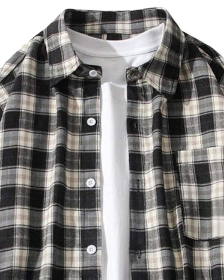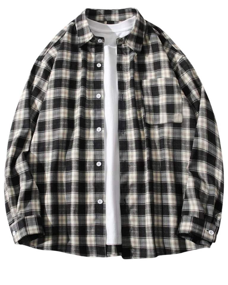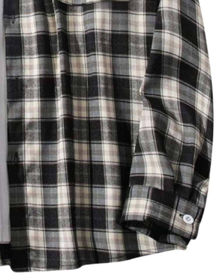 Men Beige Brown Plaid Casual Shirt Jacket Cotton Polyester Long Sleeve Button Down Check Style With Adjustable Hem Design