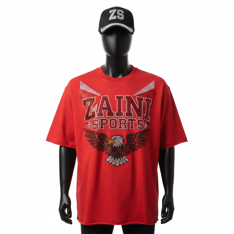 Men Boxy T Shirt Premium Cotton Single Jersey 220 GSM Red Oversized Fit Rhinestone Heat Transfer Custom Logo men's shirts