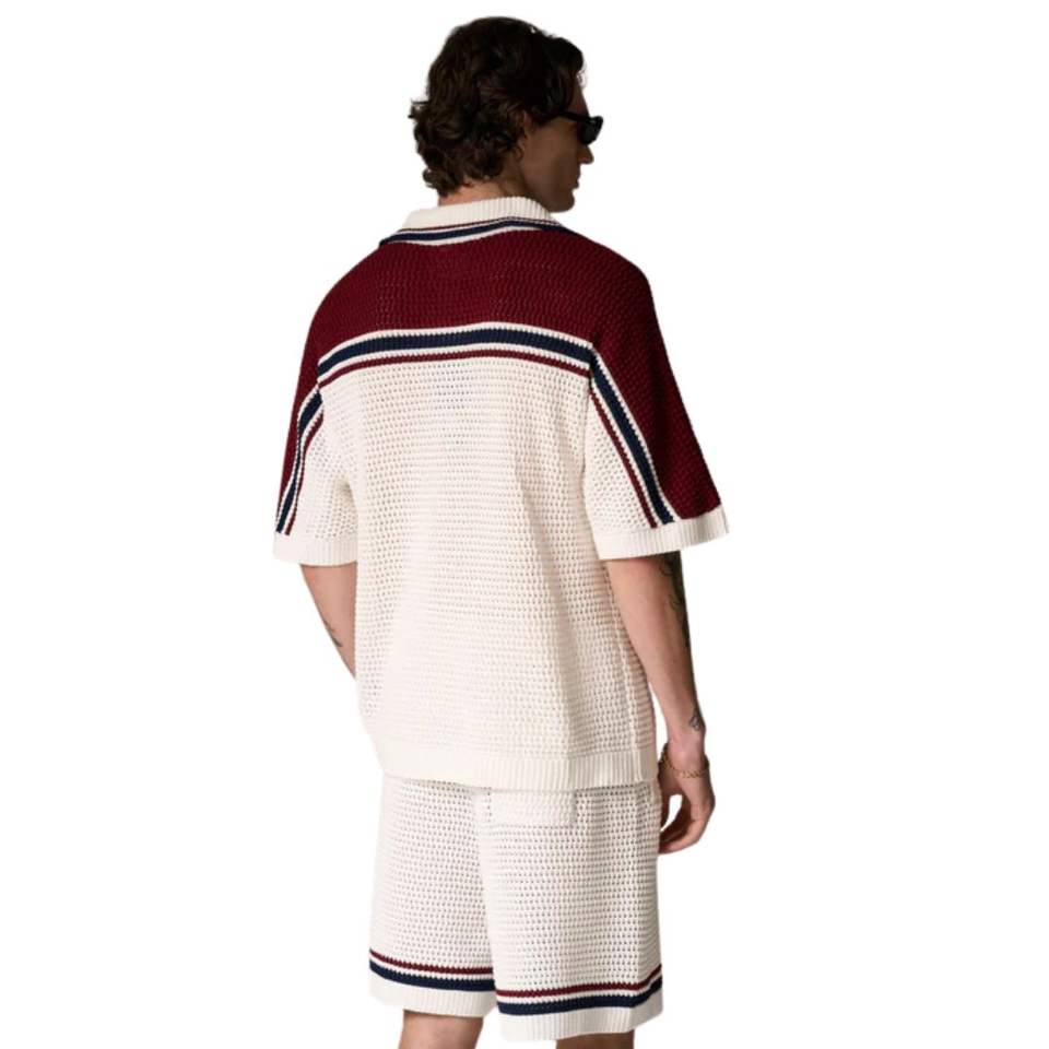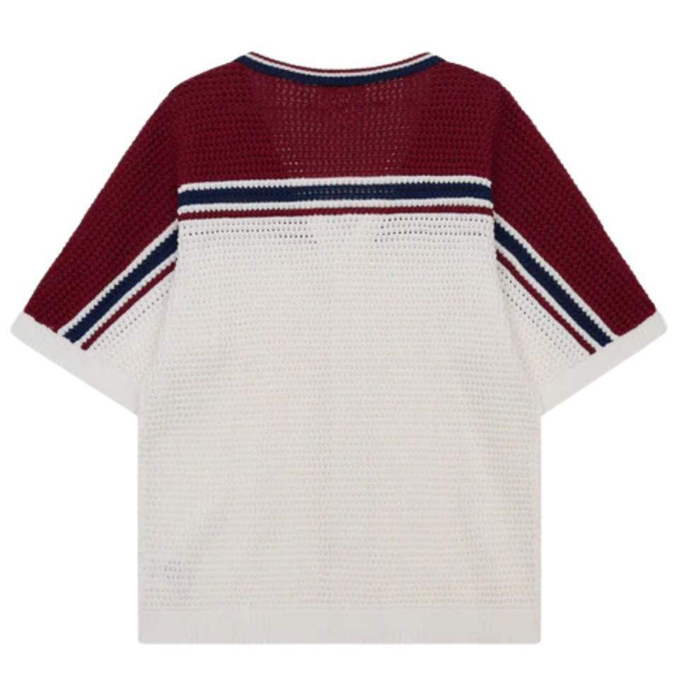 Men Color Block Crochet Knitted Stripe Shirt Short Sleeve Button Down Summer Casual Knitwear OEM Wholesale Supply