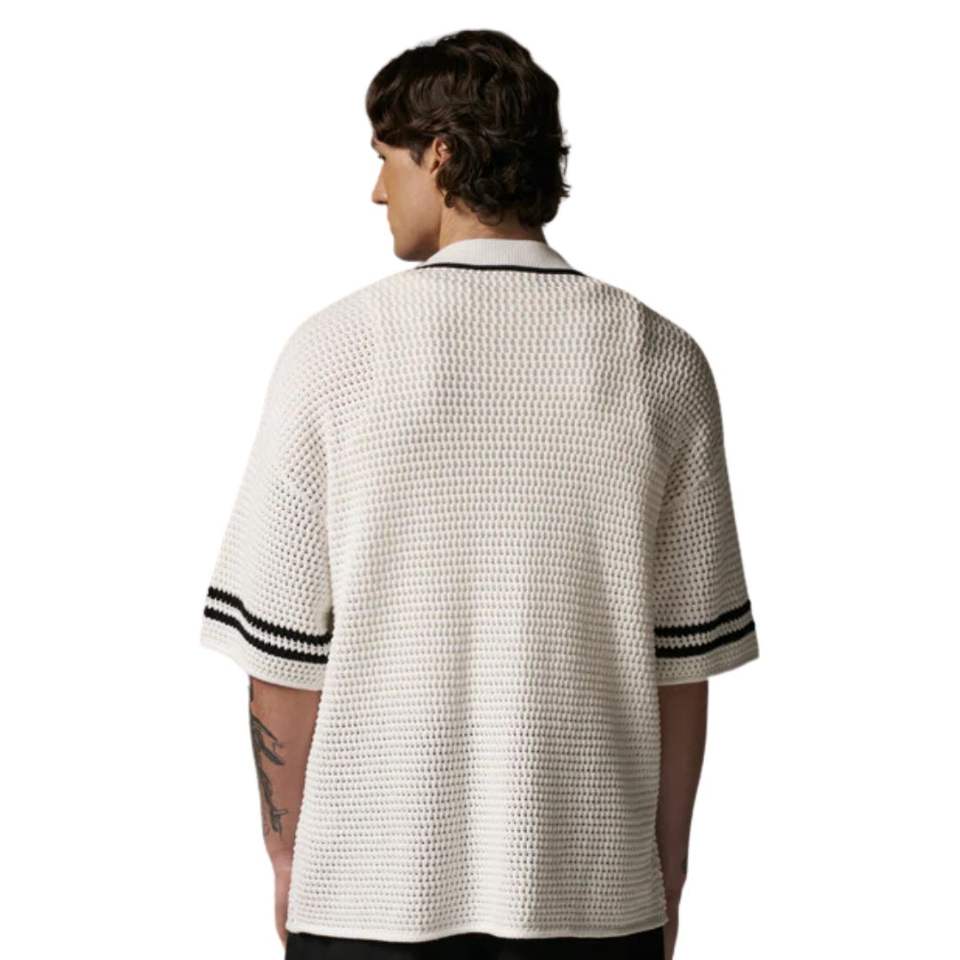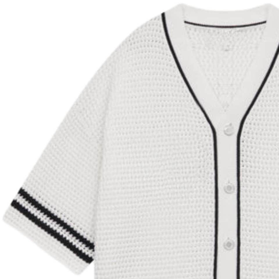 Men Crochet Knitted Baseball Shirt Short Sleeve Button Down Stripe Trim Casual Summer Knit Top OEM Wholesale Supply