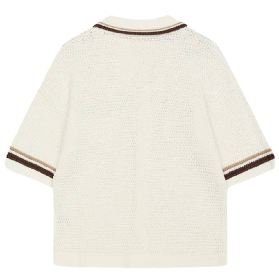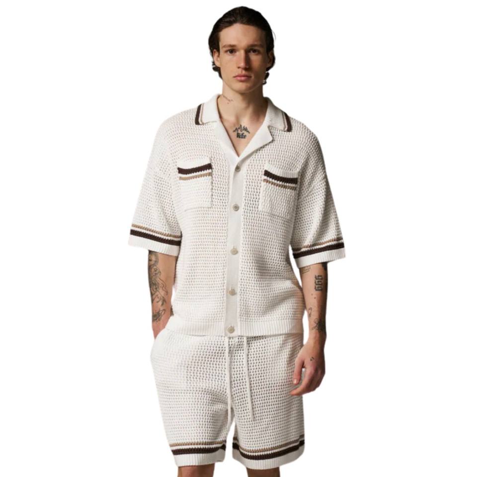 Men Crochet Knitted Stripe Shirt Short Sleeve Button Down Summer Casual Knitwear Top OEM Wholesale Custom Supply